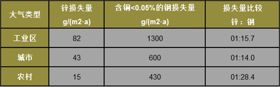 一般情况下可以选用《锌和钢在不同大气中的重量损失表》,如表1所示来估计锌层的使用年限,对于锌层重量的选用做参考。按照大气类型即使用区域的不同,在30年保温管的标准寿命条件下,锌层的选用应该至少大于275g/m2。因此需引起关注,也可以根据实际设计情况进行考虑。
